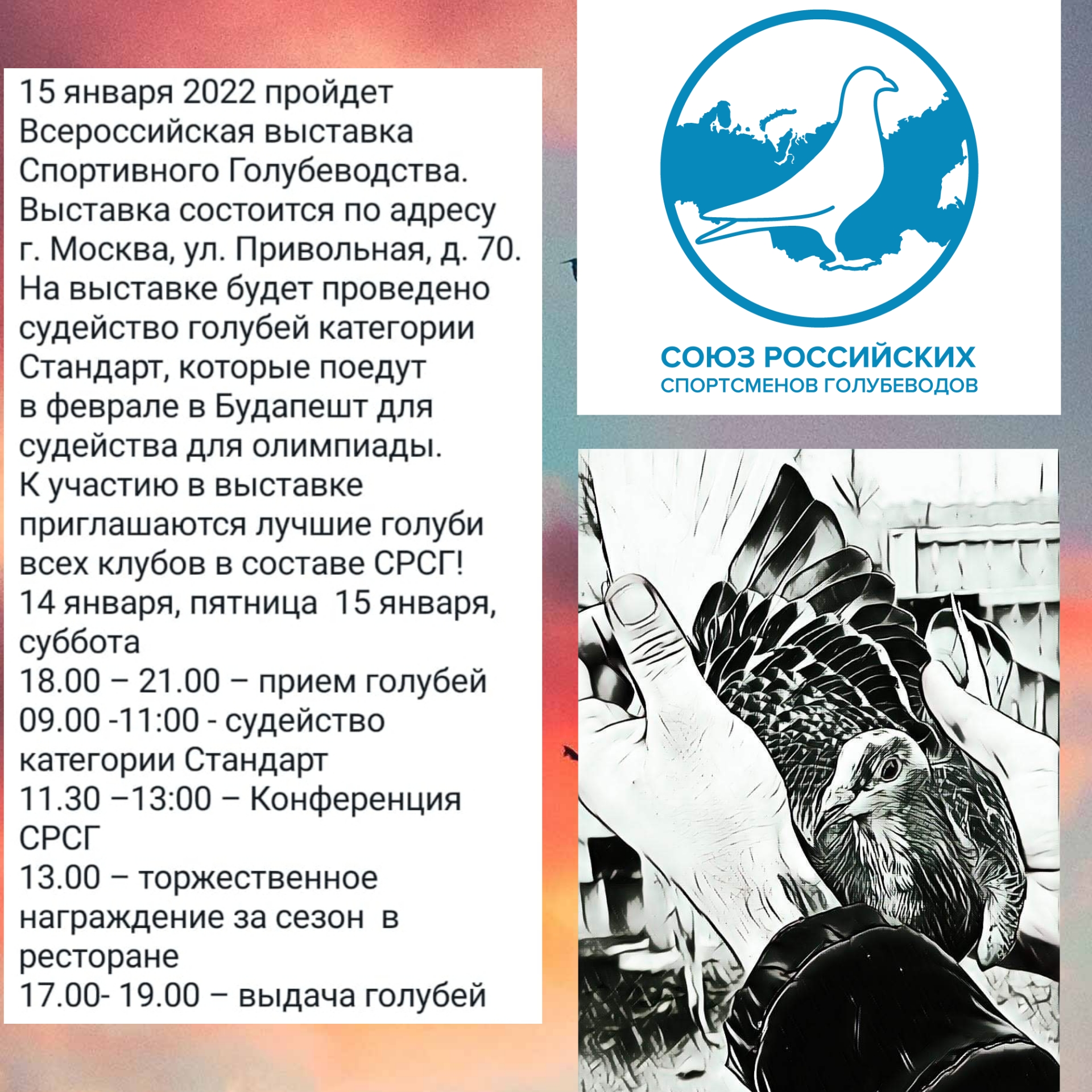 15 января 2022 пройдет Всероссийская выставка Спортивного Голубеводства. Сейчас идет выбор наилучшего места для проведения мероприятия в рамках Москвы и области, позднее мы сообщим точное место, дата же определена точно. На выставке будет проведено судейство голубей категории Стандарт, которые поедут в феврале в Будапешт для судейства для олимпиады. К участию в выставке приглашаются лучшие голуби всех клубов в составе СРСГ!